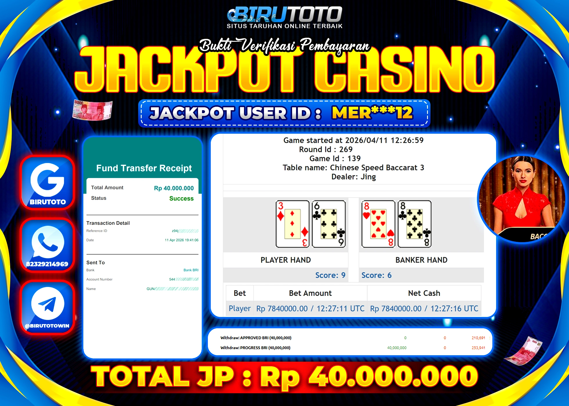 BIRUTOTO JACKPOT LIVE CASINO SPEED BACCARAT Rp.40.000.000 LUNAS