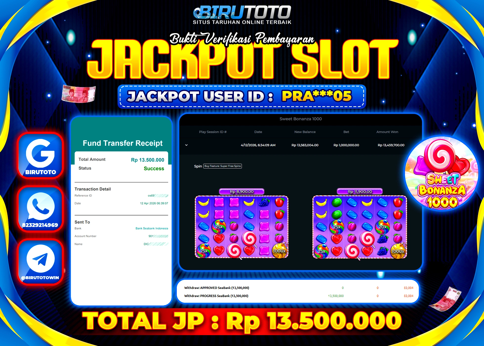BIRUTOTO JACKPOT SLOT SWEET BONANZA 1000 Rp.13.500.000 LUNAS