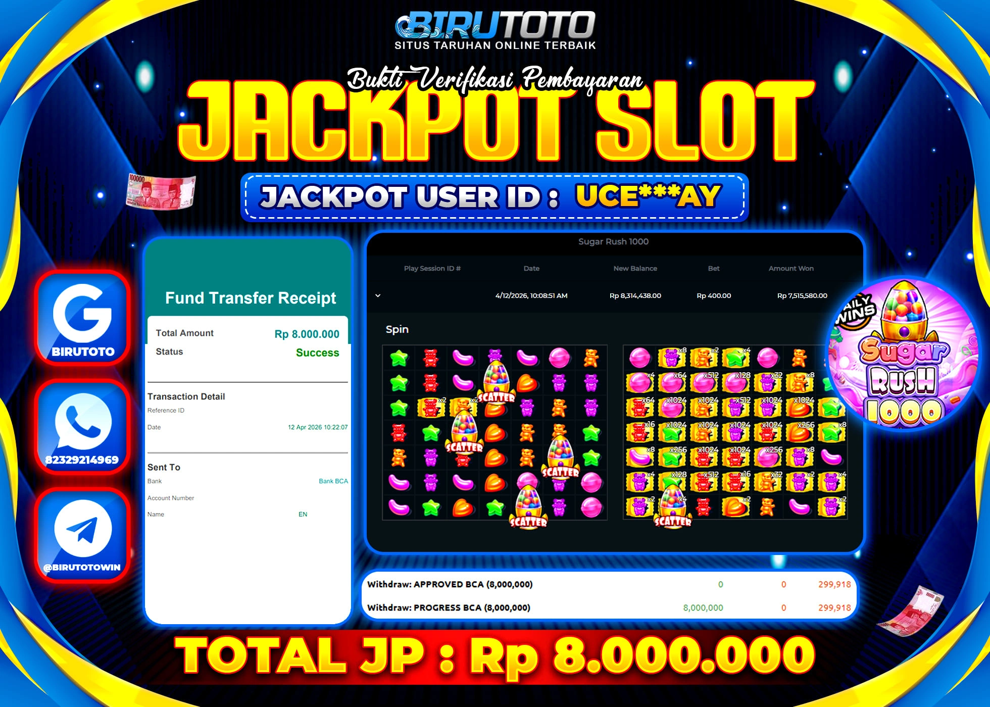 BIRUTOTO JACKPOT SLOT SUGAR RUSH 1000 Rp.8.000.000 LUNAS