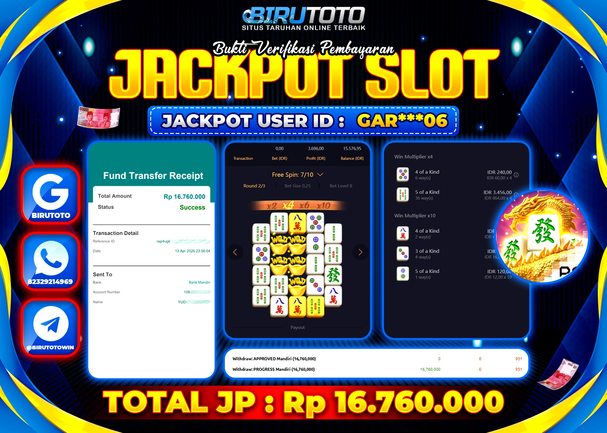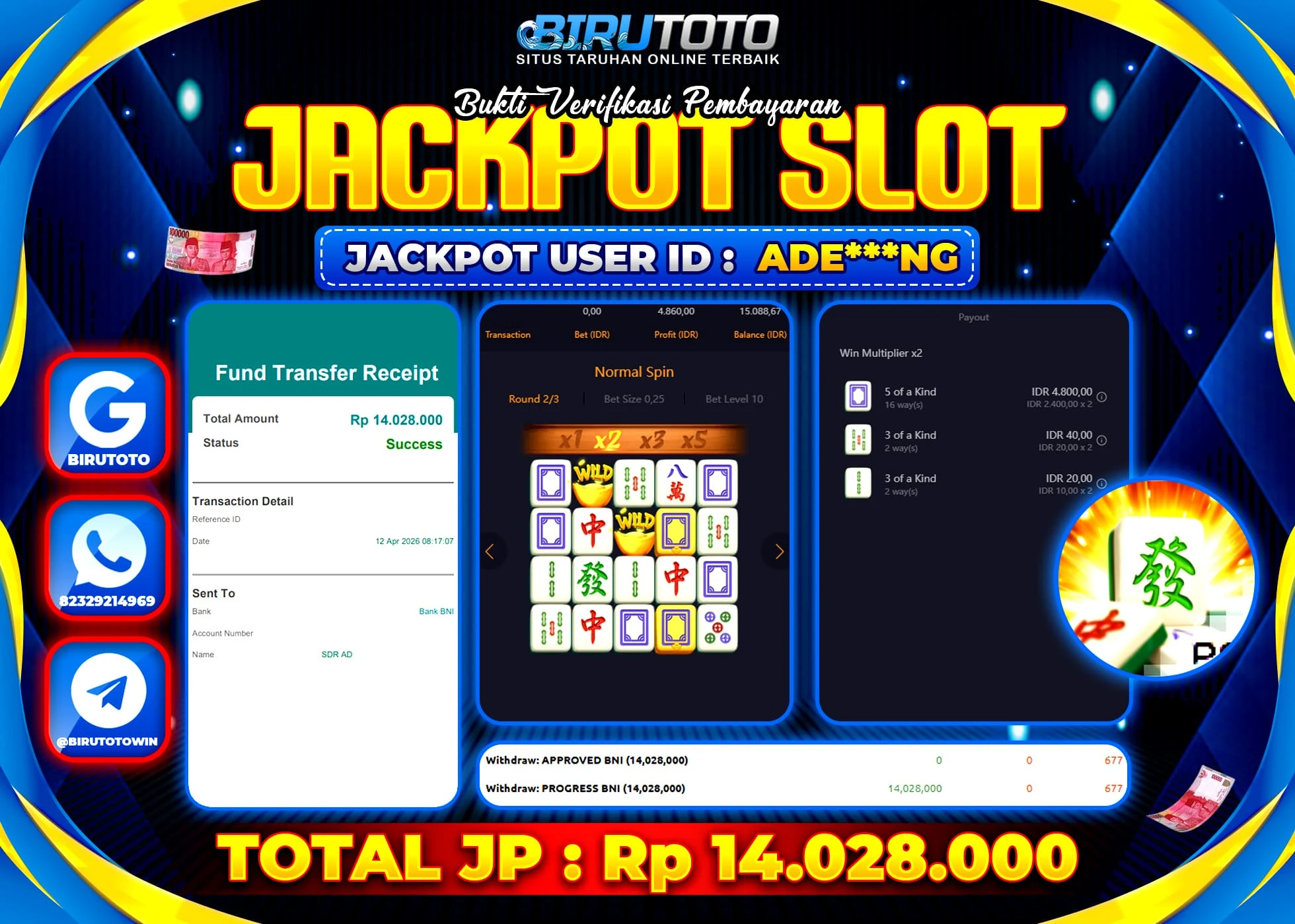 Selamat Kepada Member BIRUTOTO ADE***NG Telah Jackpot Di SLOT MAHJONG WAYS