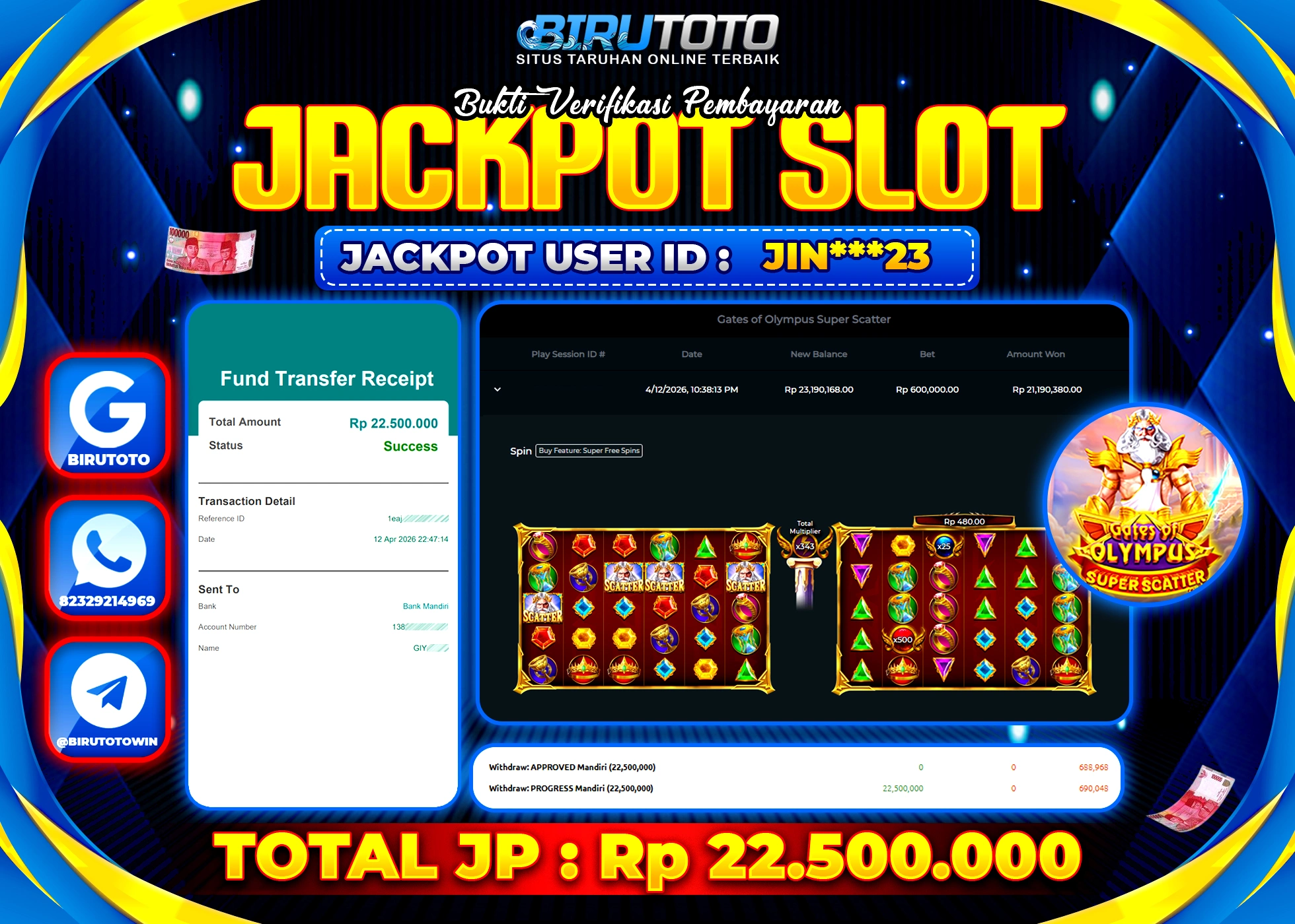 BIRUTOTO JACKPOT SLOT GATES OF OLYMPUS SUPER SCATTER Rp.22.500.000 LUNAS
