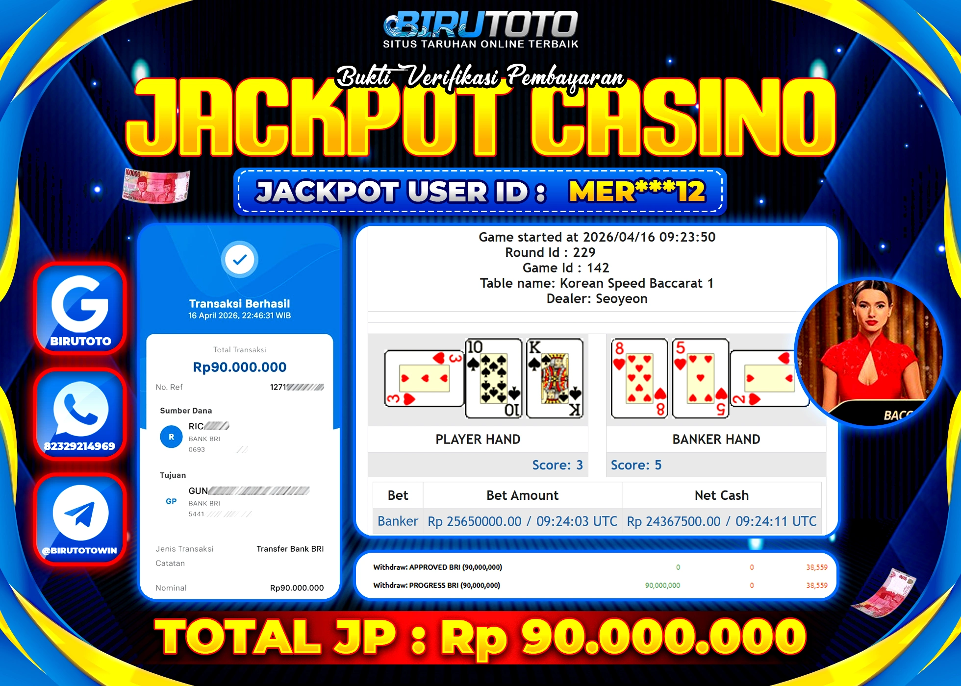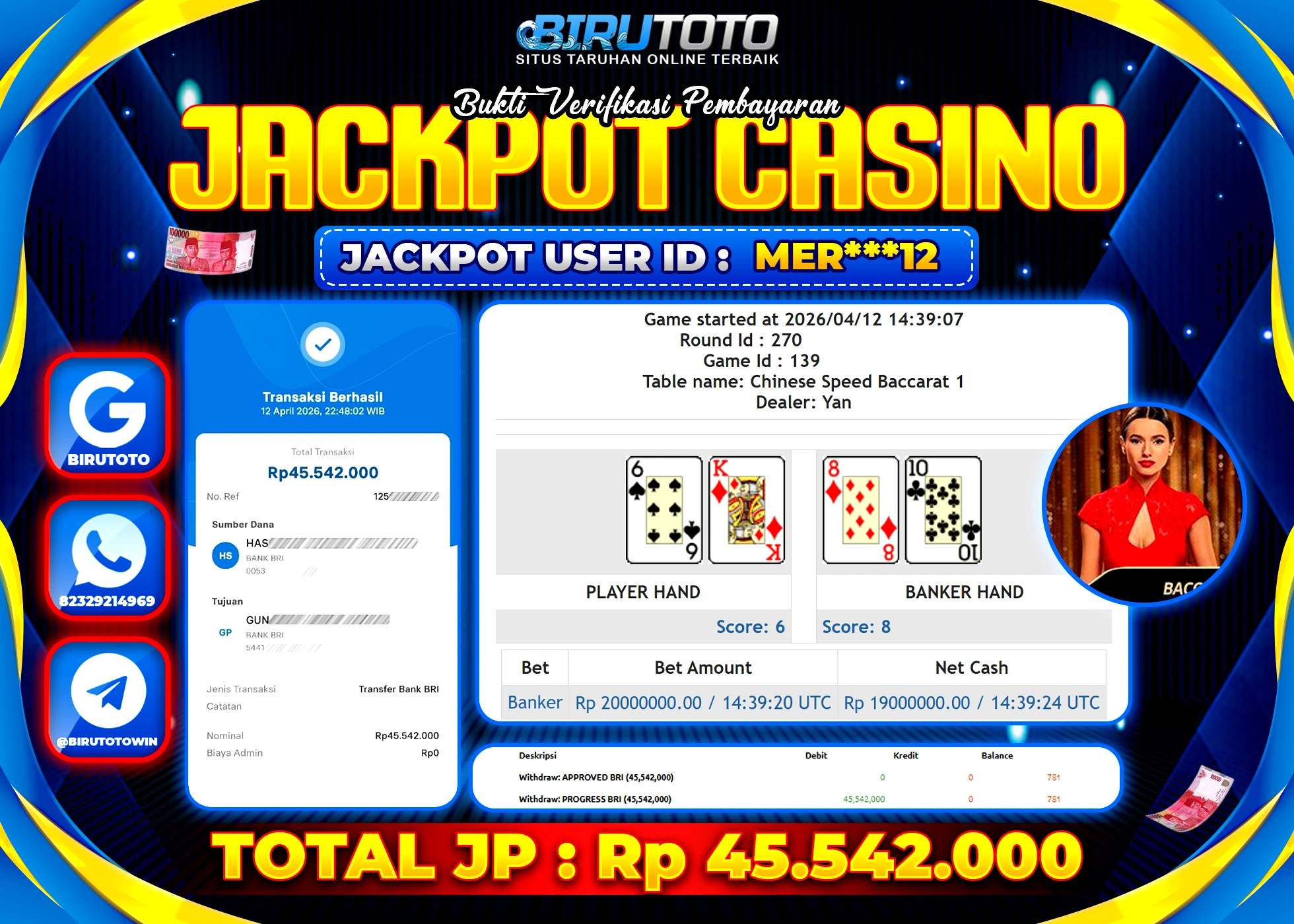Selamat Kepada Member BIRUTOTO YAN***7 Telah Jackpot Di LIVE CASINO BACCARAT
