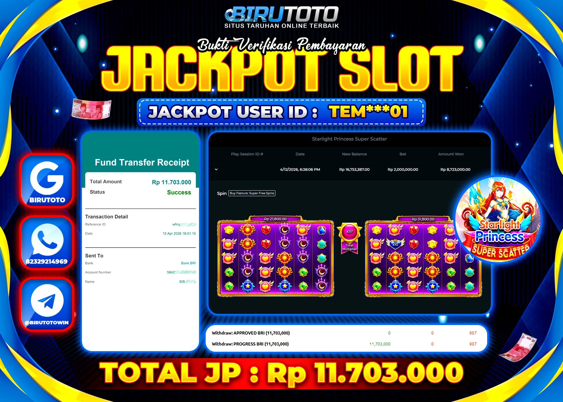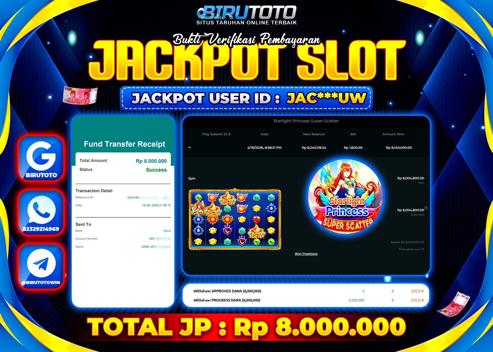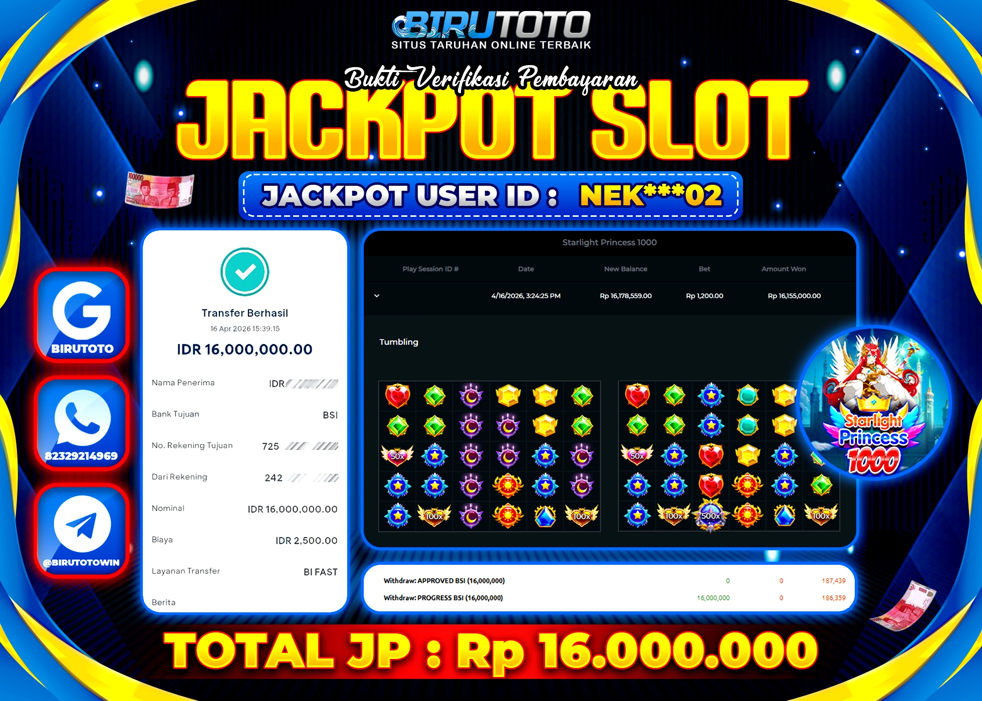 BIRUTOTO JACKPOT SLOT STARLIGHT PRINCES 1000 Rp.16.000.000 LUNAS