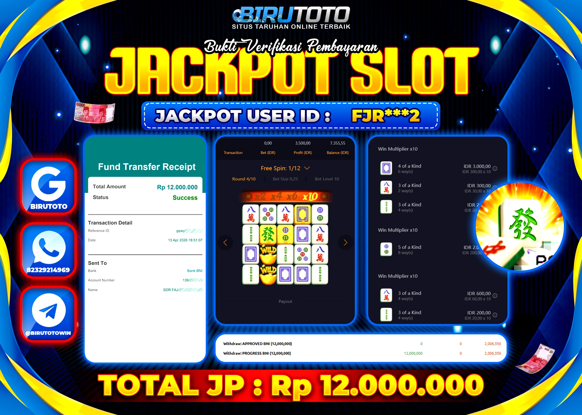 BIRUTOTO JACKPOT SLOT MAHJONG WAYS Rp.12.000.000 LUNAS