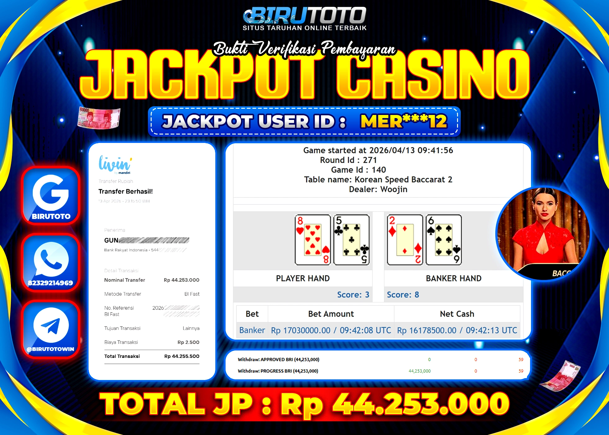 BIRUTOTO JACKPOT LIVE CASINO SPEED BACCARAT Rp.44.253.000 LUNAS