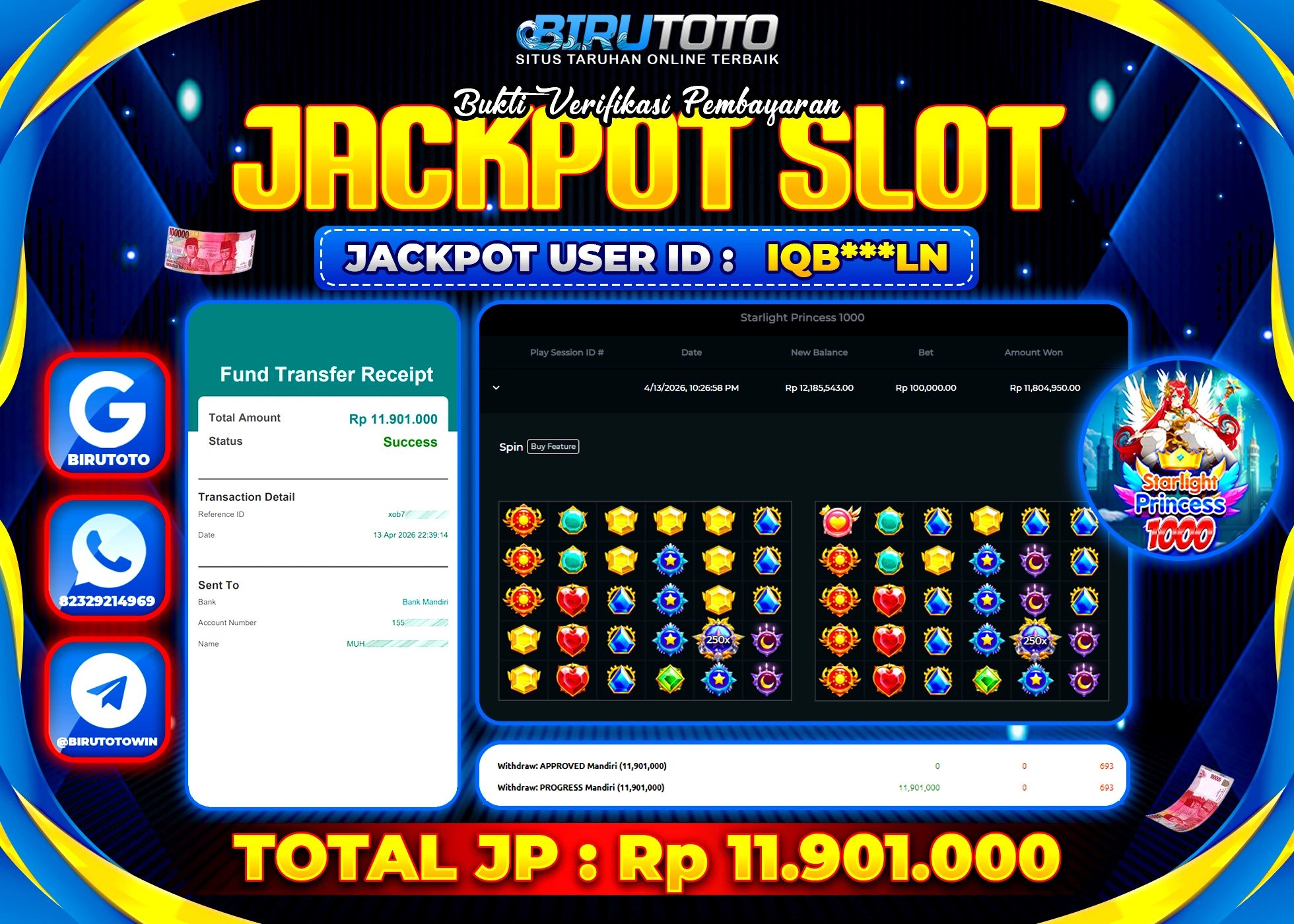 BIRUTOTO JACKPOT SLOT STARLIGHT PRINCES 1000 Rp.11.901.000 LUNAS