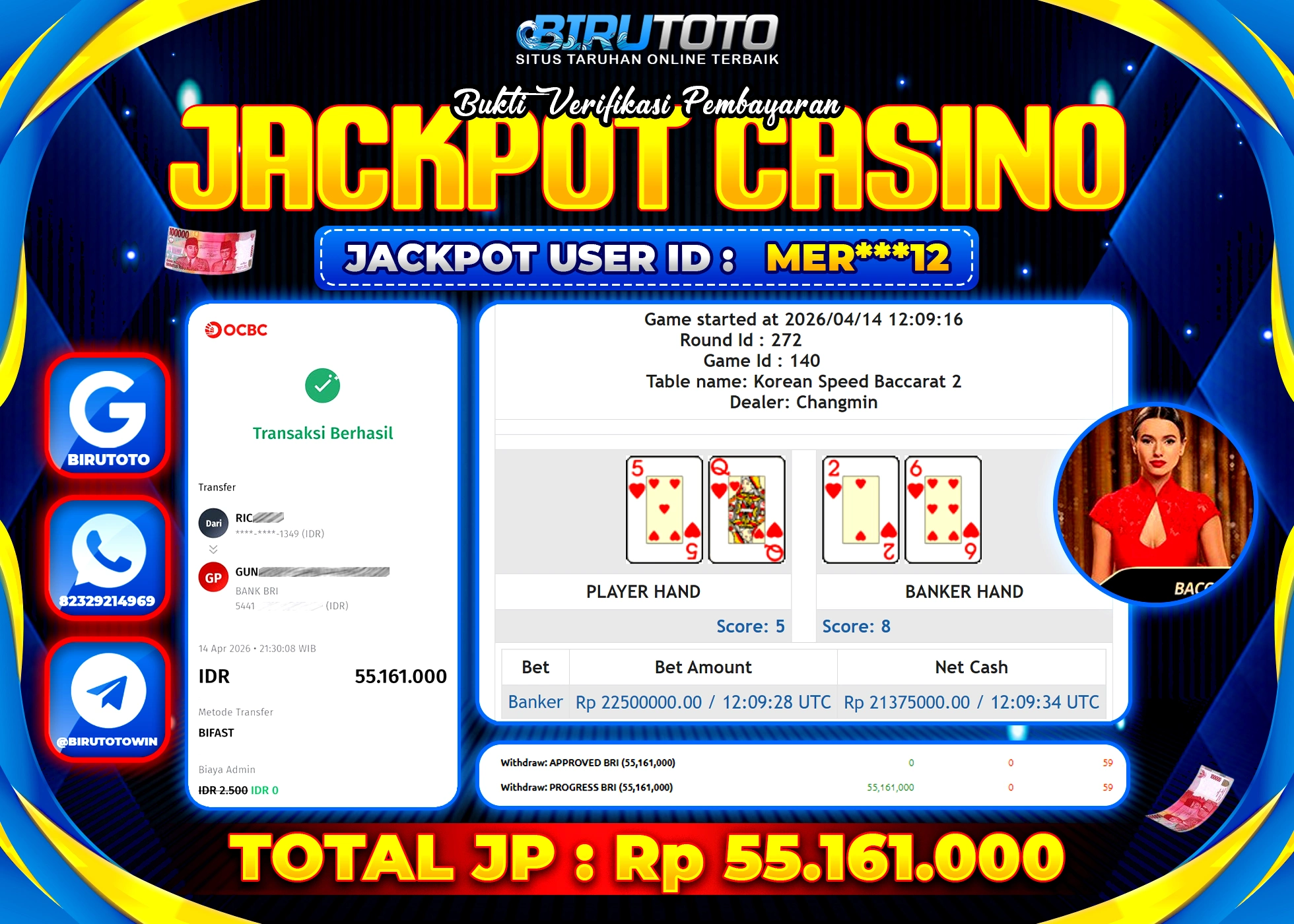 BIRUTOTO JACKPOT LIVE CASINO SPEED BACCARAT Rp.55.161.000 LUNAS