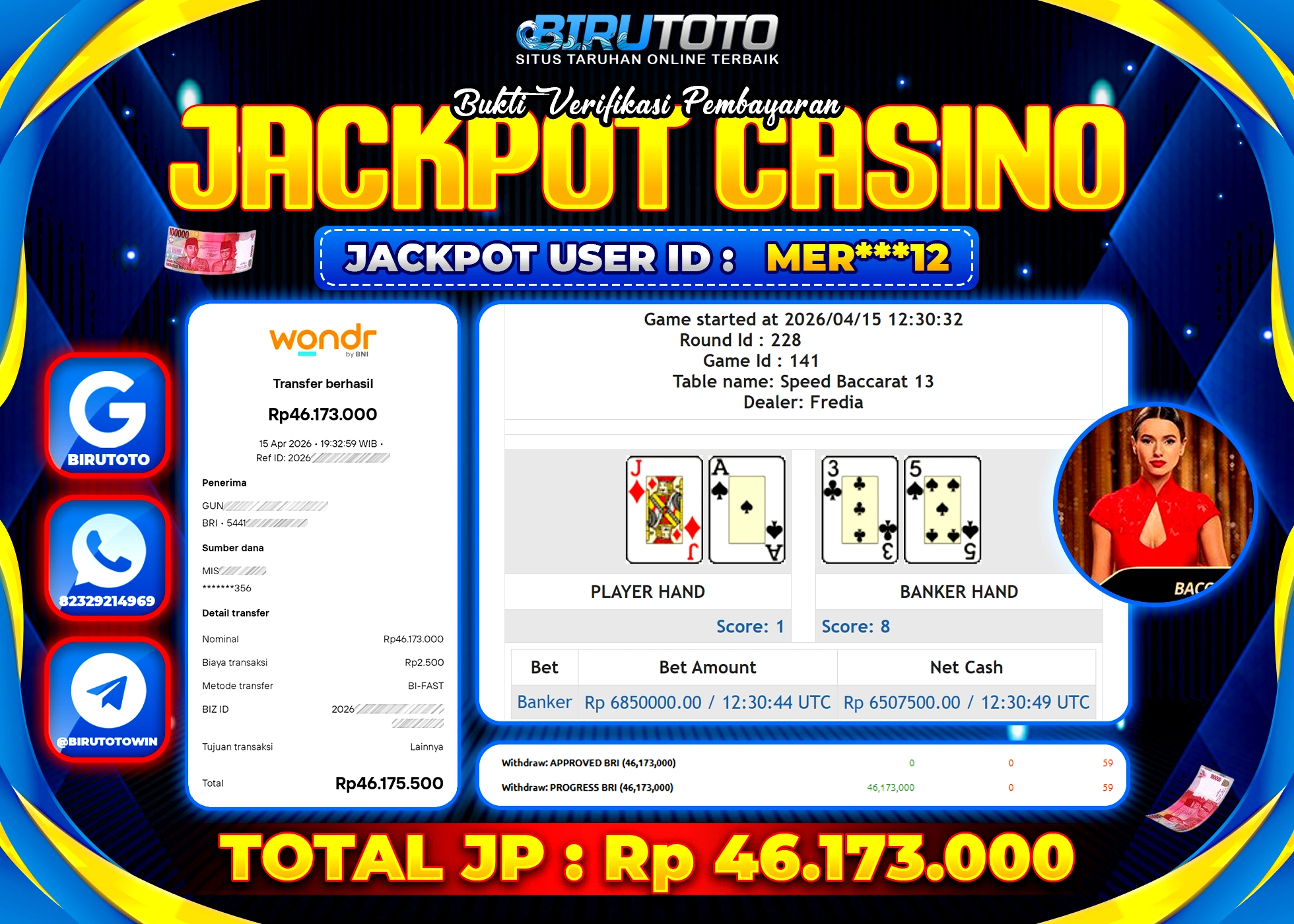 BIRUTOTO JACKPOT LIVE CASINO SPEED BACCARAT Rp.46.173.000 LUNAS