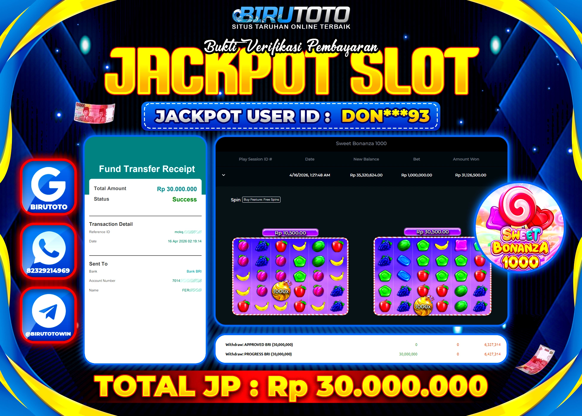 BIRUTOTO JACKPOT SLOT SWEET BONANZA 1000 Rp.30.000.000 LUNAS