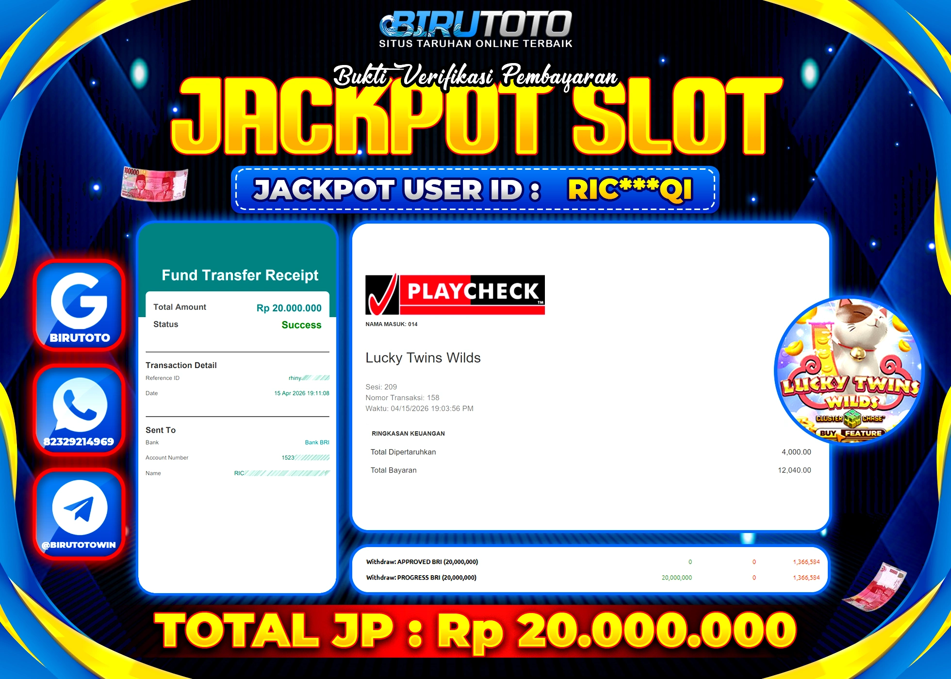 Selamat Kepada Member BIRUTOTO RIC***QI Telah Jackpot Di SLOT LUCKY TWINS WILDS