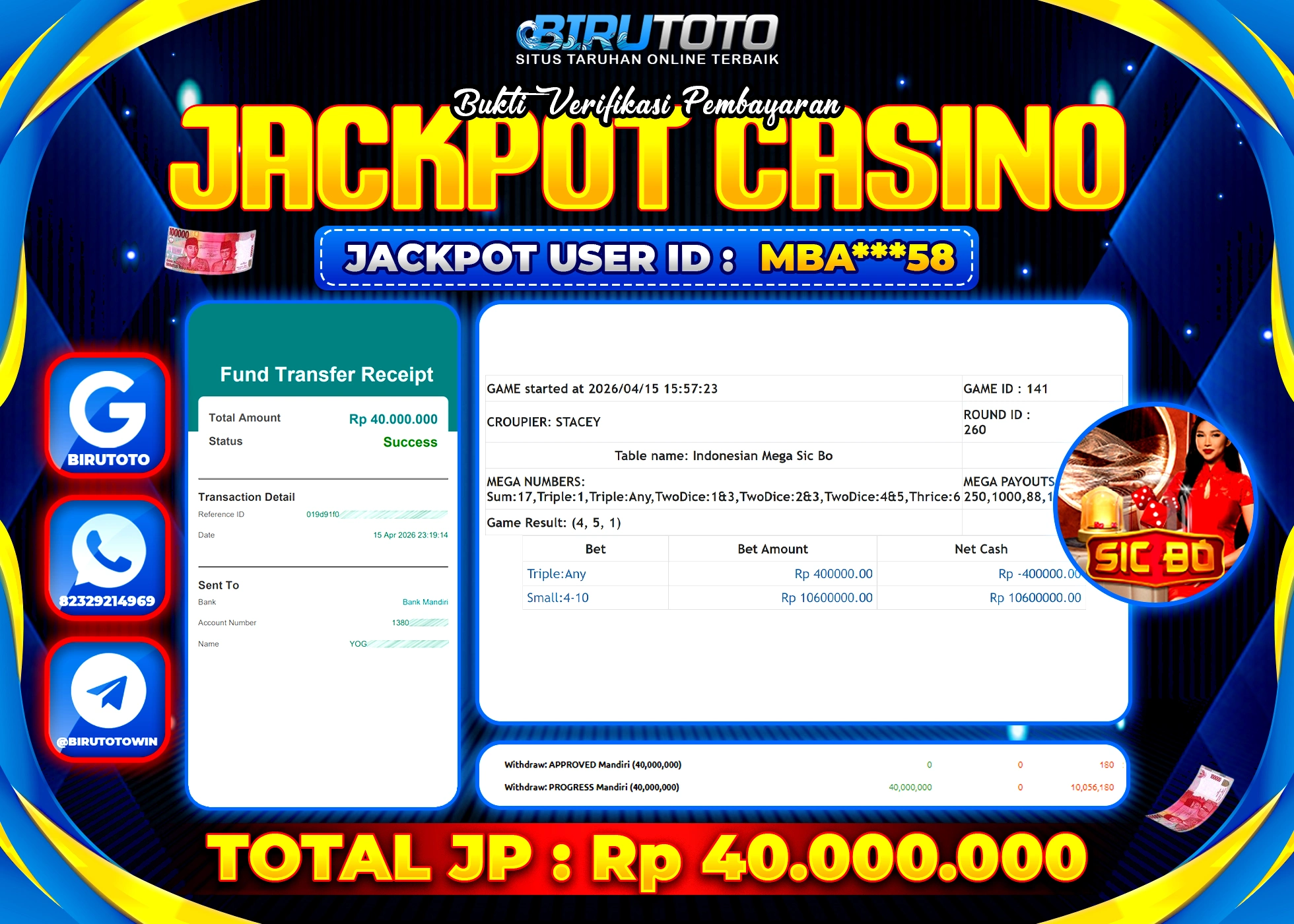 BIRUTOTO JACKPOT LIVE CASINO MEGA SICBO Rp.40.000.000 LUNAS