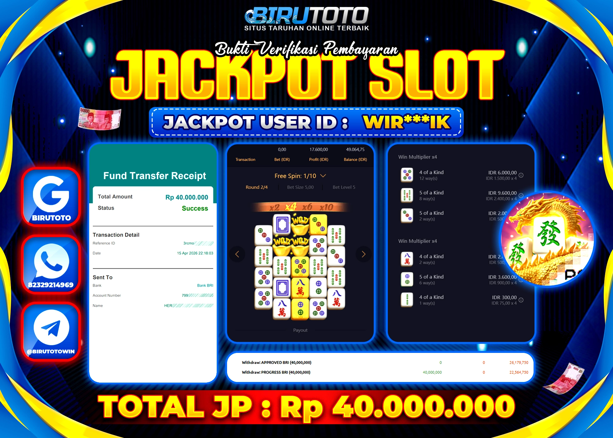 Selamat Kepada Member BIRUTOTO IRV***00 Telah Jackpot Di SLOT MAHJONG WAYS