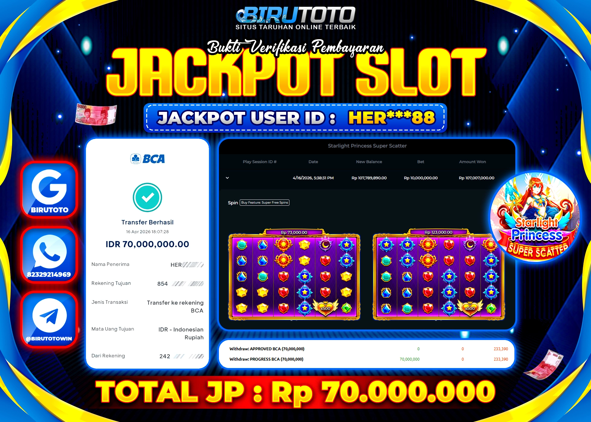 BIRUTOTO JACKPOT SLOT STARLIGHT PRINCES SUPER SCATTER Rp.70.000.000 LUNAS