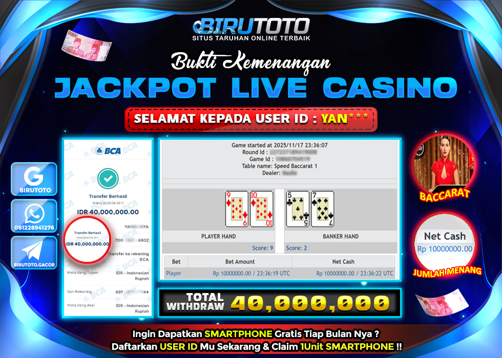 Selamat Kepada Member BIRUTOTO YAN***7 Telah Jackpot Di LIVE CASINO BACCARAT