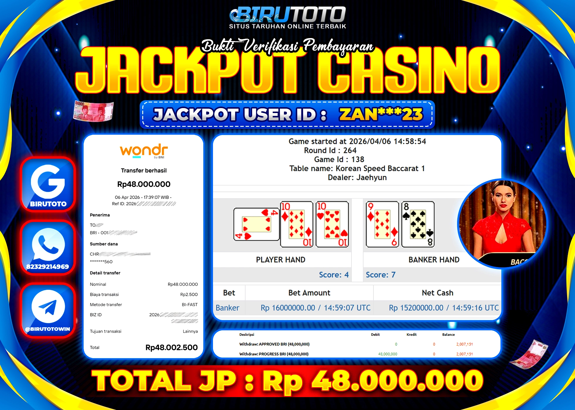 Selamat Kepada Member BIRUTOTO ZAN***23 Telah Jackpot Di LIVE CASINO BACCARAT