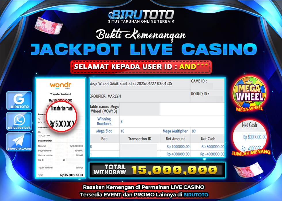 BIRUTOTO JACKPOT LIVE CASINO MEGA WHEEL Rp.15.000.000 LUNAS
