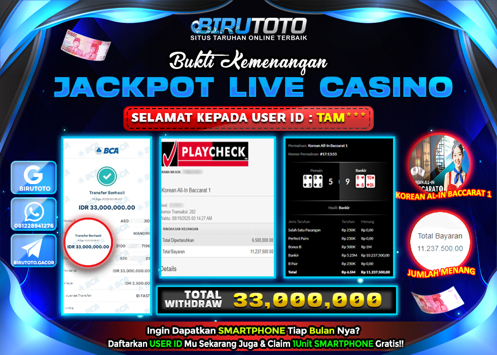 BIRUTOTO JACKPOT LIVE CASINO KOREAN ALL-IN BACCARAT 1 Rp.33.000.000 LUNAS