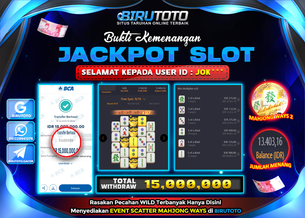 Selamat Kepada Member BIRUTOTO JO**** Telah Jackpot Di SLOT MAHJONG WAYS 2