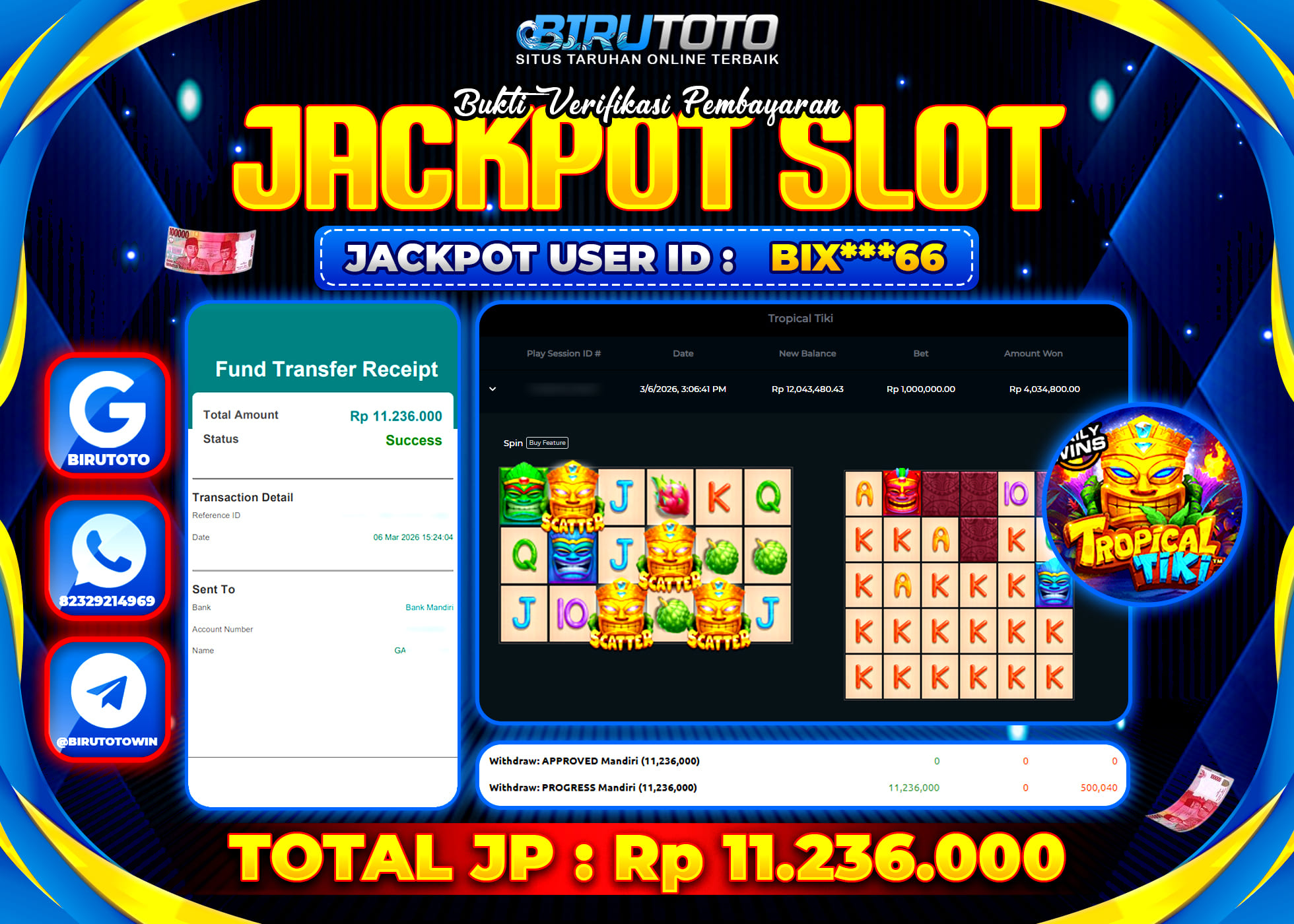 Selamat Kepada Member BIRUTOTO BIX***66 Telah Jackpot Di SLOT TROPICAL TIKI