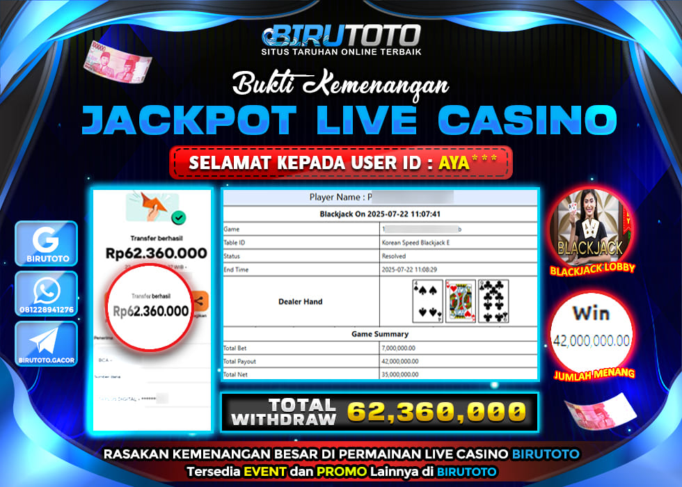 BIRUTOTO JACKPOT LIVE CASINO BLACKJACK LOBBY Rp.62.360.000 LUNAS