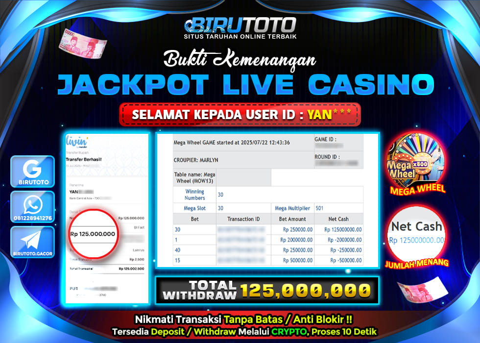 BIRUTOTO JACKPOT LIVE CASINO MEGA WHEEL Rp.125.000.000 LUNAS