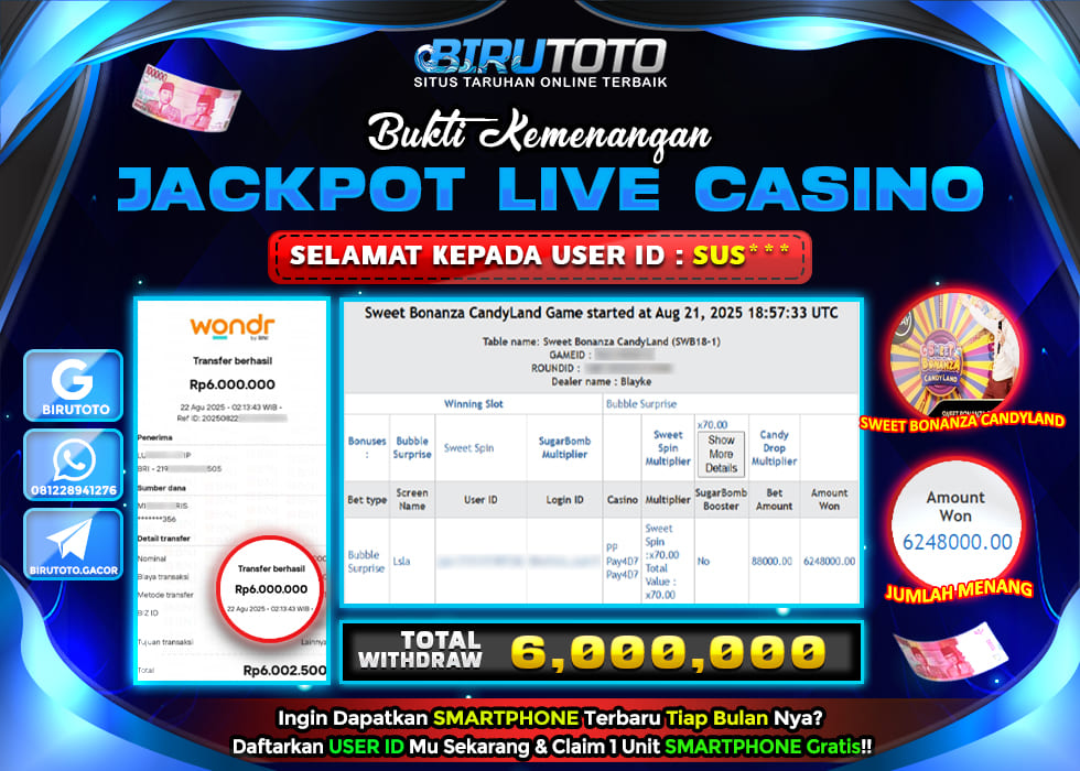 Selamat Kepada Member BIRUTOTO SU**** Telah Jackpot Di LIVE CASINO SWEET BONANZA CANDYLAND