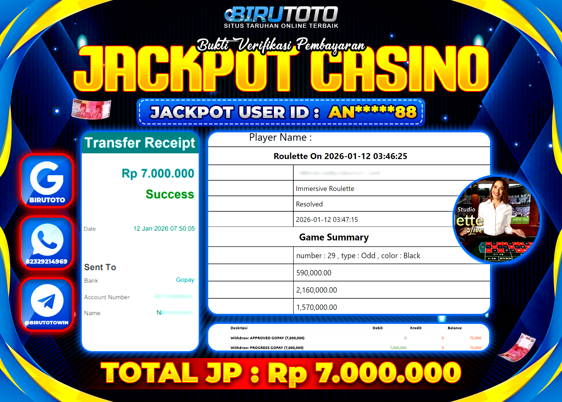 BIRUTOTO JACKPOT LIVE CASINO ROULETTE Rp.7.000.000 LUNAS