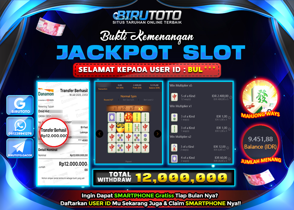 BIRUTOTO JACKPOT SLOT MAHJONG WAYS Rp.12.000.000 LUNAS
