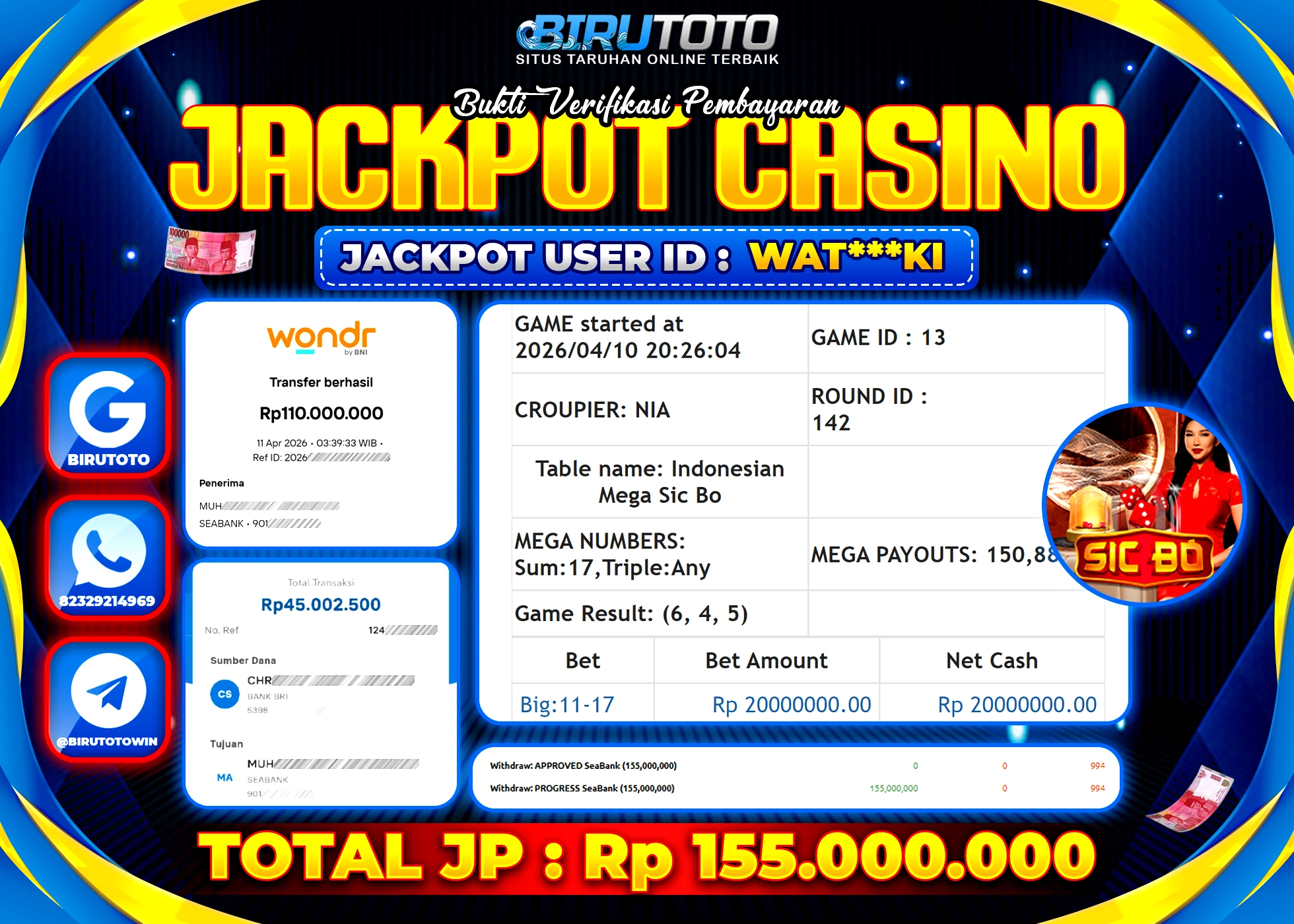 BIRUTOTO JACKPOT LIVE CASINO MEGA SICBO Rp.155.000.000 LUNAS