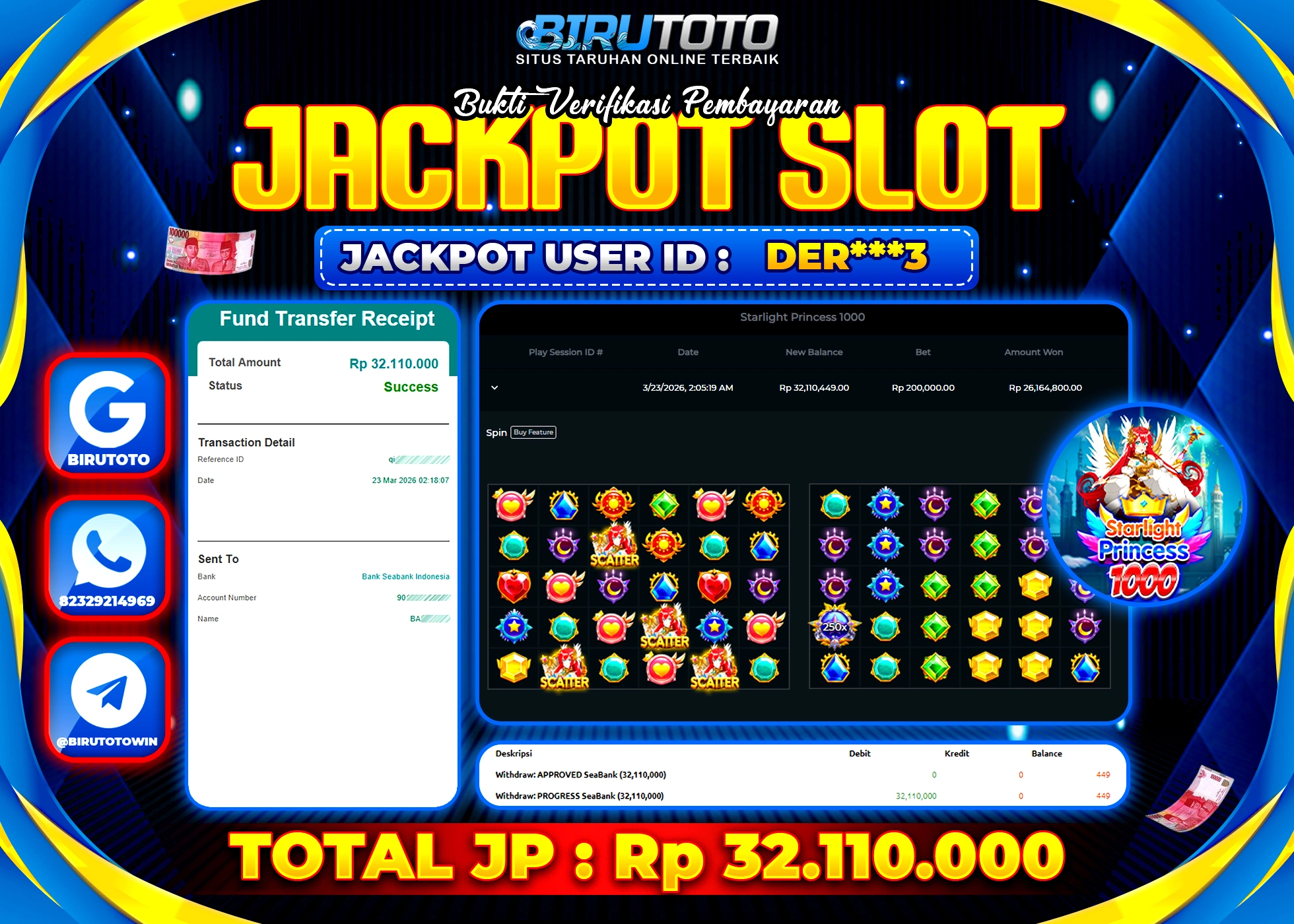 BIRUTOTO JACKPOT SLOT STARLIGHT PRINCES 1000 Rp.32.110.000 LUNAS