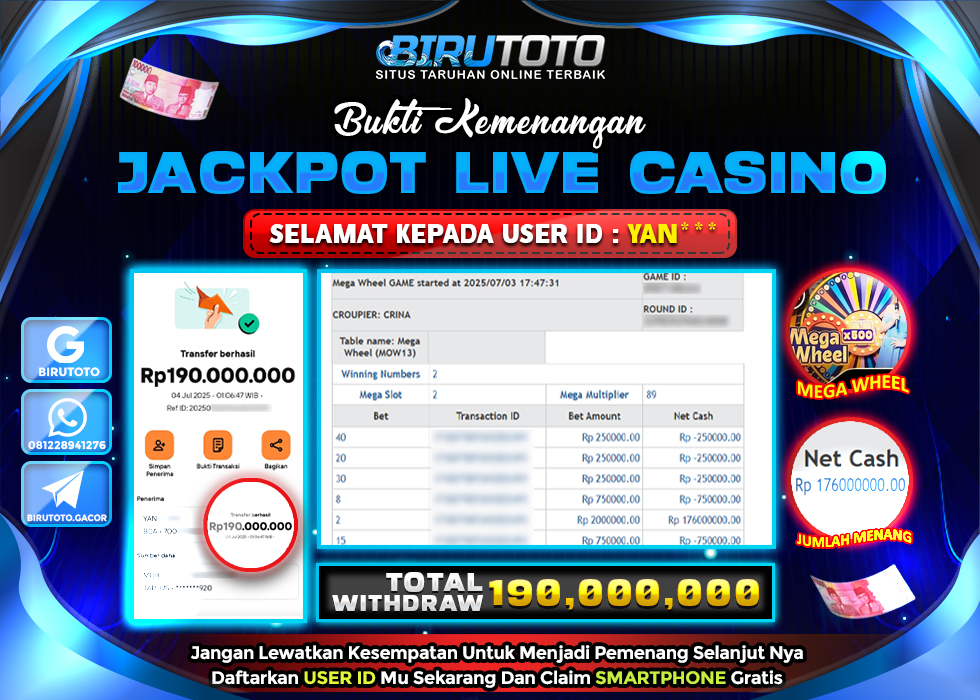 Selamat Kepada Member BIRUTOTO YA**** Telah Jackpot Di LIVE CASINO MEGA WHEEL