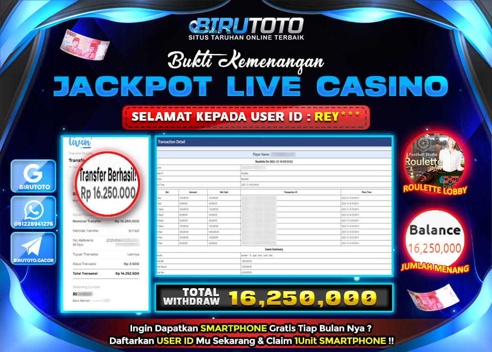 BIRUTOTO JACKPOT LIVE CASINO ROULETTE LOBBY Rp.16.250.000 LUNAS