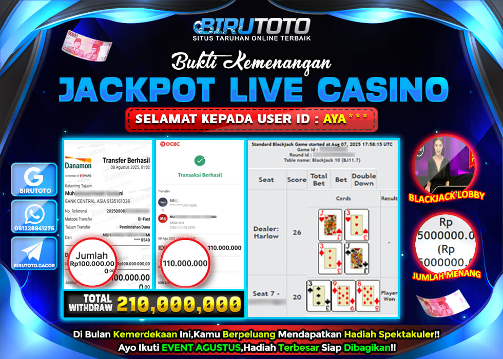 BIRUTOTO JACKPOT LIVE CASINO BLACKJACK LOBBY Rp.210.000.000 LUNAS