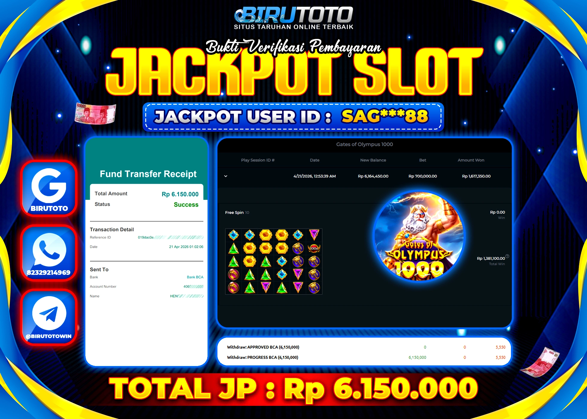 BIRUTOTO JACKPOT SLOT GATES OF OLYMPUS 1000 Rp.6.150.000 LUNAS