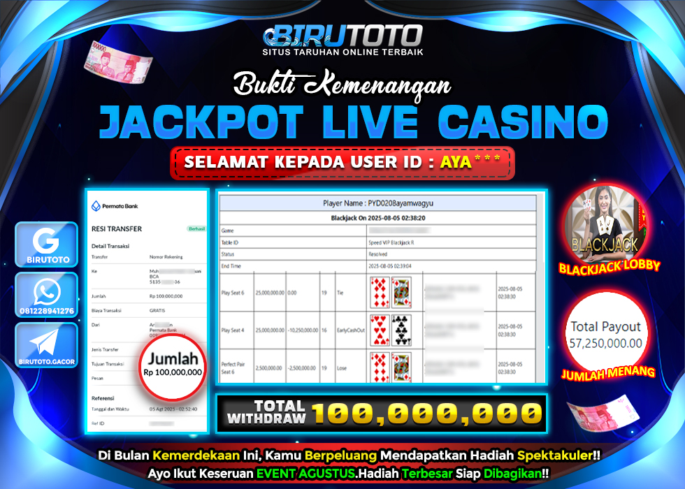 BIRUTOTO JACKPOT LIVE CASINO BLACKJACK LOBBY Rp.100.000.000 LUNAS