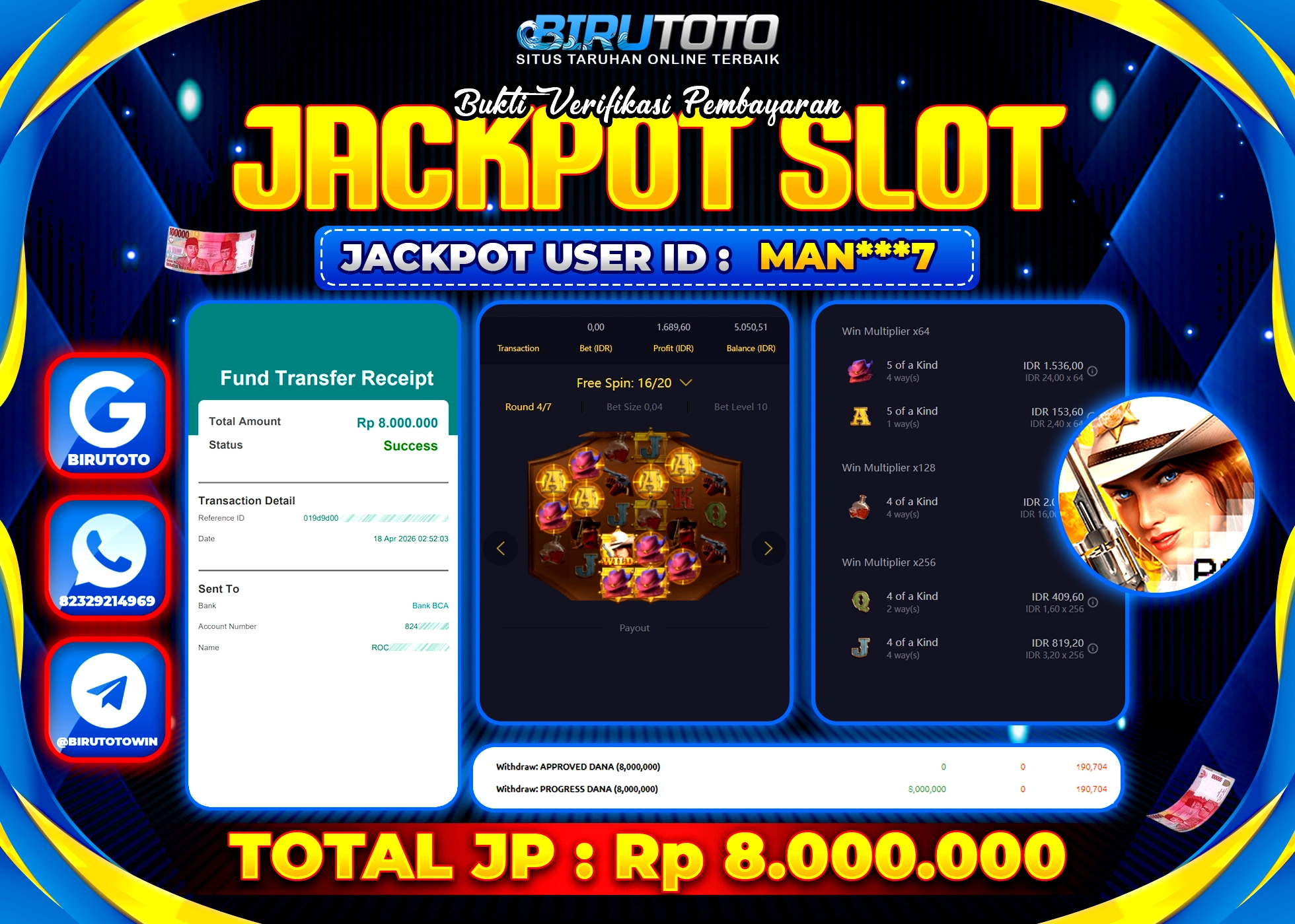 Selamat Kepada Member BIRUTOTO MAN***7 Telah Jackpot Di SLOT WILD BOUNTY SHOWDOWN