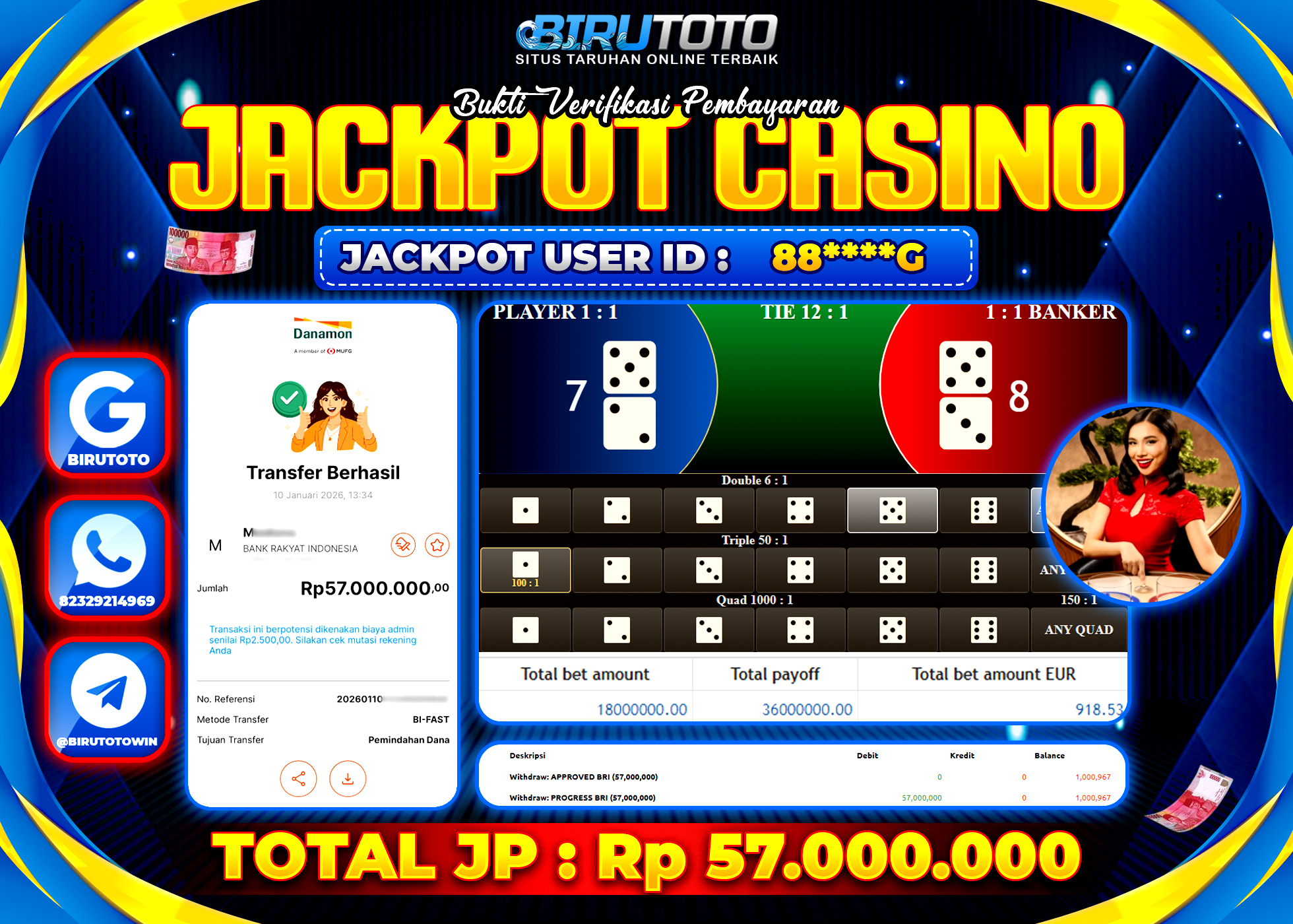 BIRUTOTO JACKPOT LIVE CASINO MEGA SIC BAC Rp.57.000.000 LUNAS