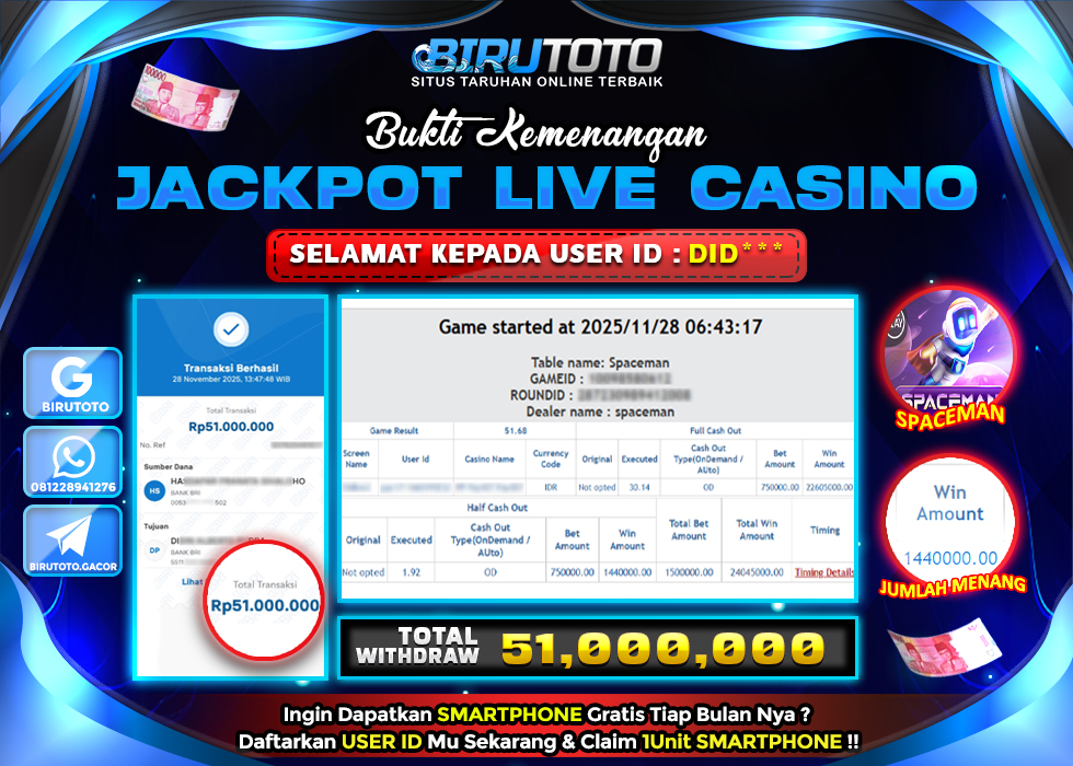 BIRUTOTO JACKPOT LIVE CASINO SPACEMAN Rp.51.000.000 LUNAS