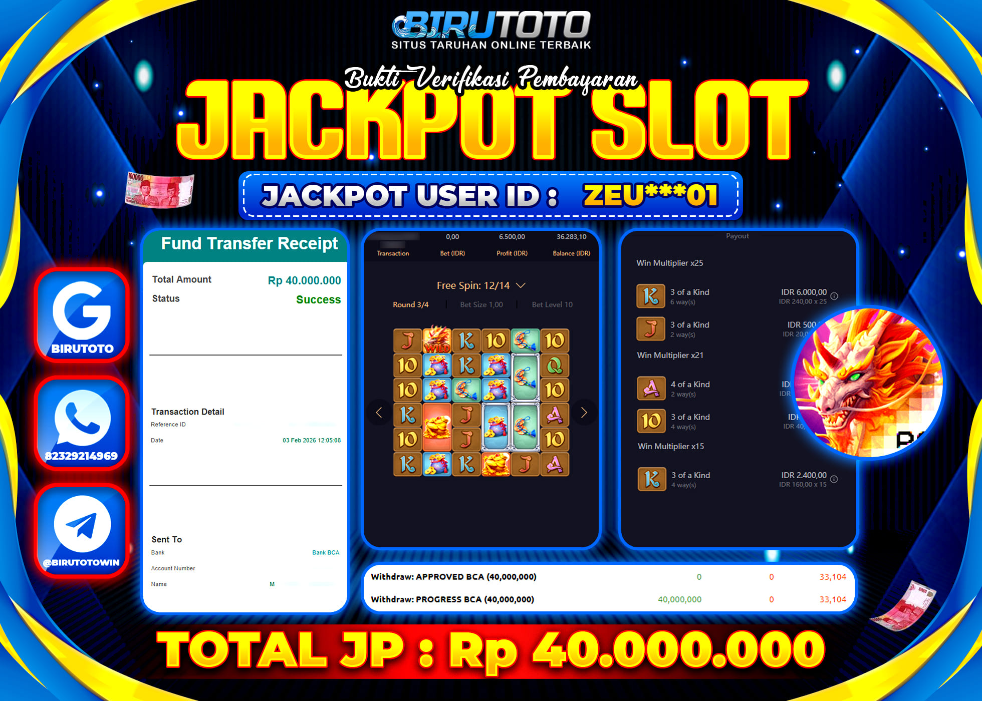 Selamat Kepada Member BIRUTOTO ZEU***01 Telah Jackpot Di SLOT WAYS OF THE QILIN