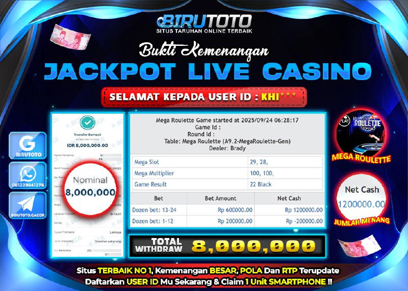 Selamat Kepada Member BIRUTOTO KH**** Telah Jackpot Di LIVE CASINO MEGA ROULLETTE