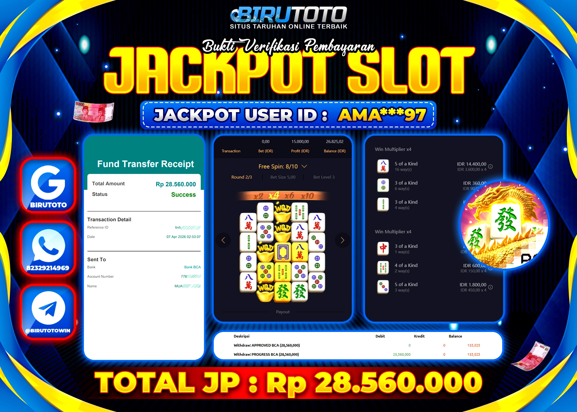 Selamat Kepada Member BIRUTOTO AMA***97 Telah Jackpot Di SLOT MAHJONG WAYS 2