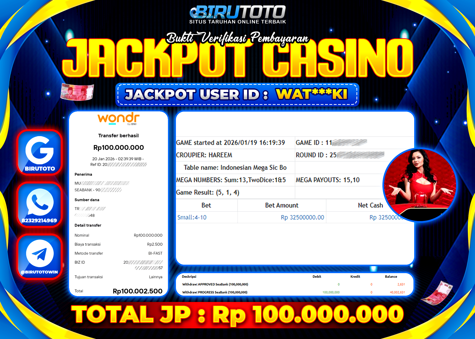 BIRUTOTO JACKPOT LIVE CASINO MEGA SICBO Rp.100.000.000 LUNAS