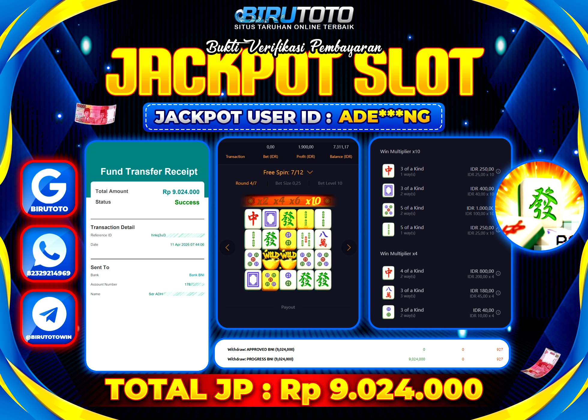 Selamat Kepada Member BIRUTOTO ADE***NG Telah Jackpot Di SLOT MAHJONG WAYS