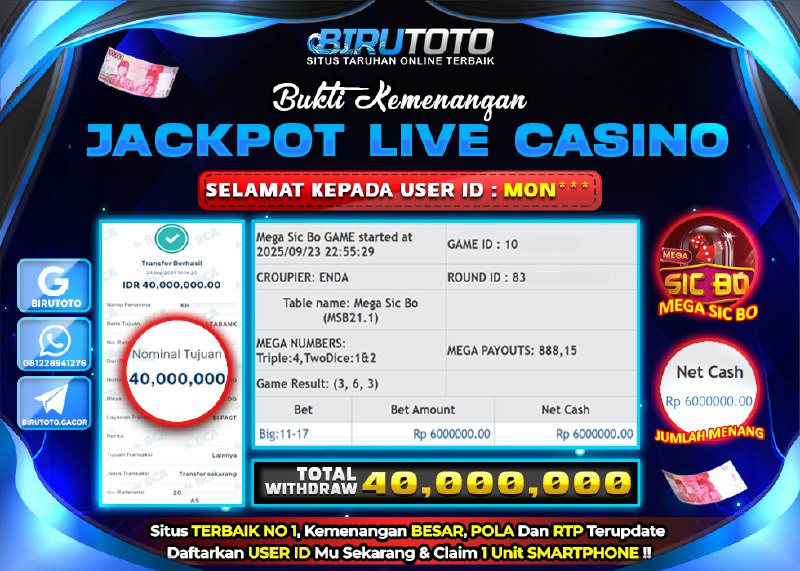BIRUTOTO JACKPOT LIVE CASINO MEGA SICBO Rp.40.000.000 LUNAS