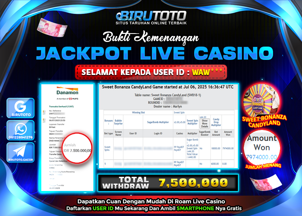 BIRUTOTO JACKPOT LIVE CASINO SWEET BONANZA CANDYLAND Rp.7.500.000 LUNAS