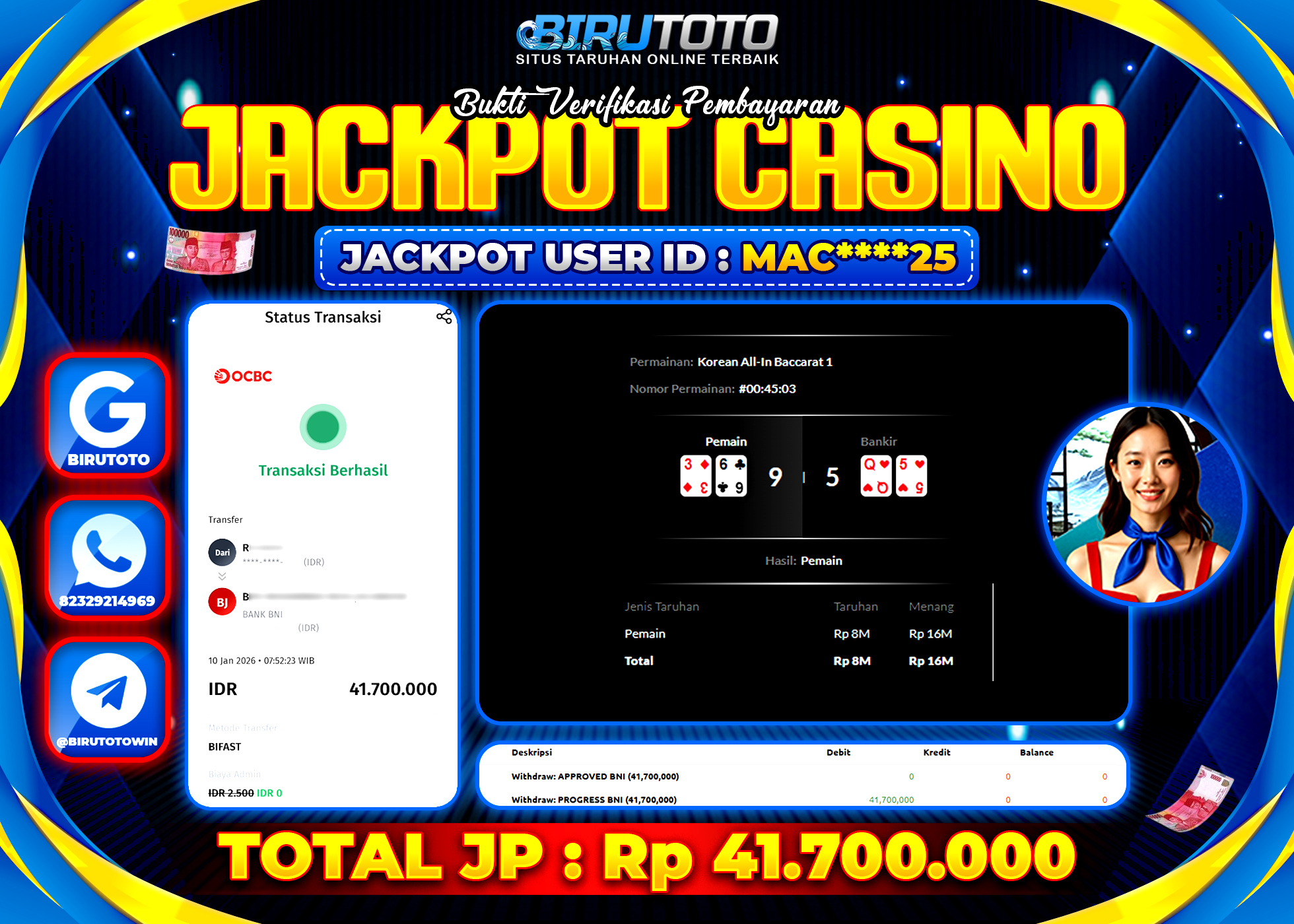 BIRUTOTO JACKPOT LIVE CASINO KOREAN ALL IN BACCARAT 1 Rp.41.700.000 LUNAS