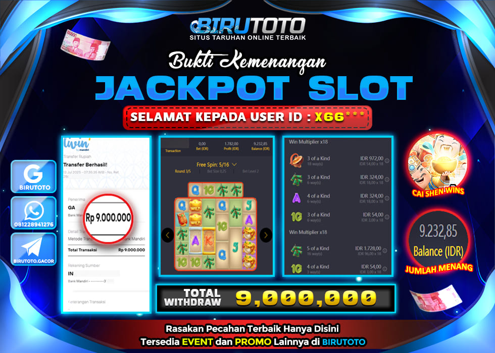 Selamat Kepada Member BIRUTOTO X6**** Telah Jackpot Di SLOT CAI SHEN WINS