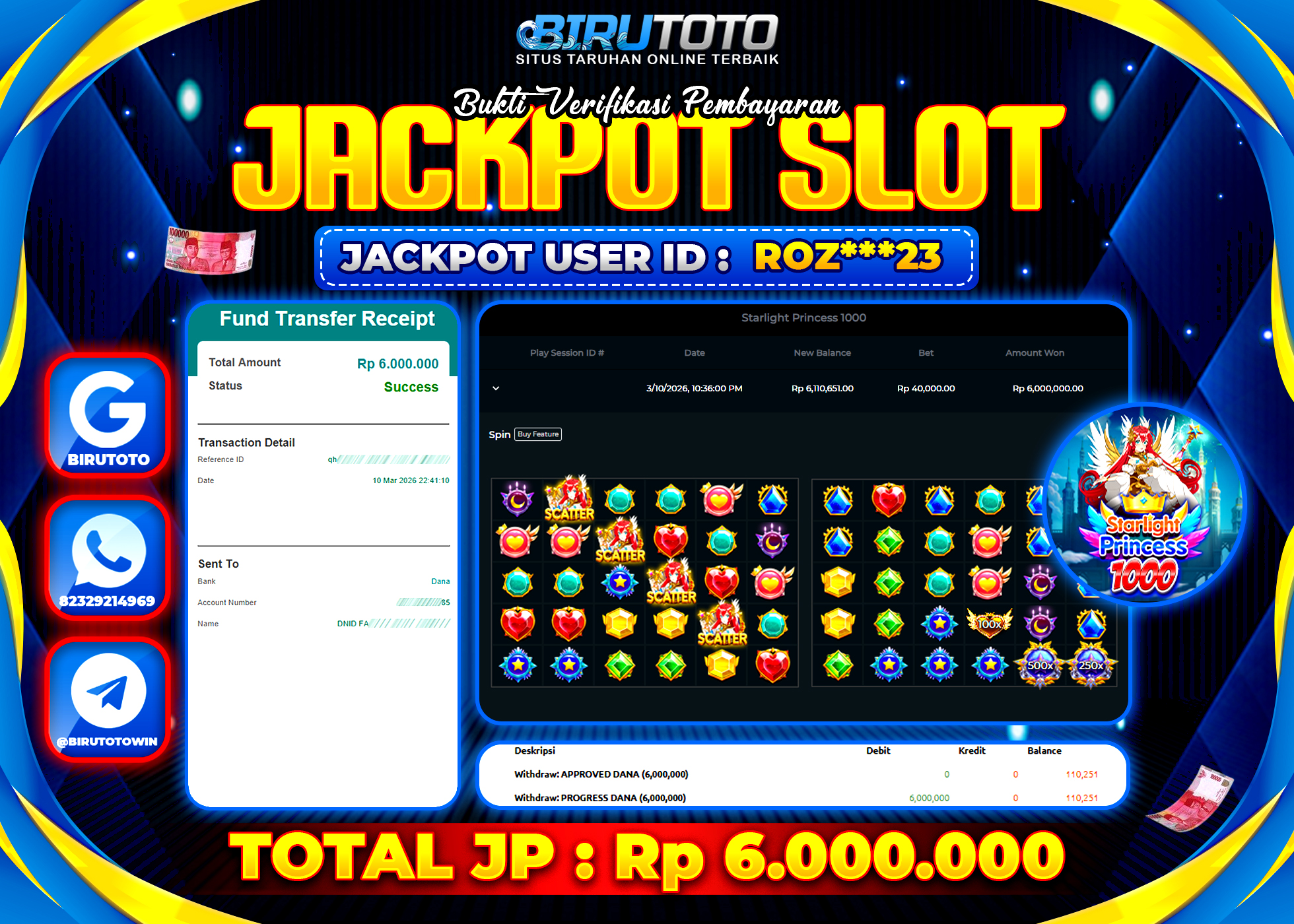 BIRUTOTO JACKPOT SLOT STARLIGHT PRINCES 1000 Rp.6.000.000 LUNAS