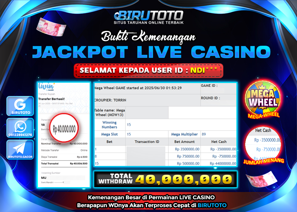 BIRUTOTO JACKPOT LIVE CASINO MEGA WHEEL Rp.40.000.000 LUNAS
