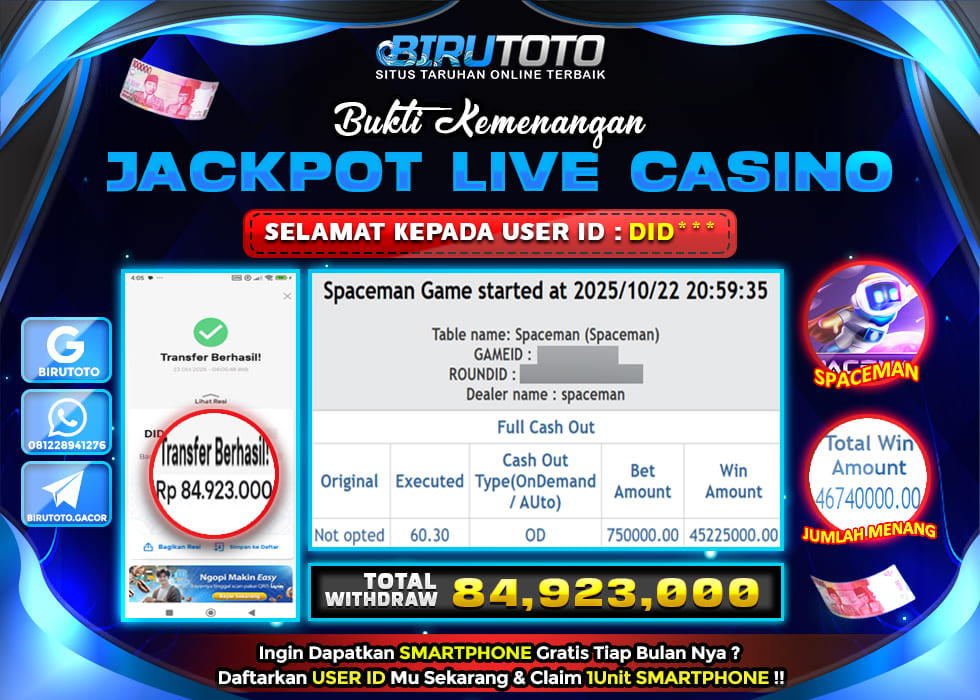 BIRUTOTO JACKPOT LIVE CASINO SPACEMAN Rp.84.923.000 LUNAS